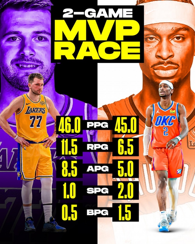 MVP竞争开始了?美媒晒图对比东契奇和SGA数据:46+11+8VS45+6+5