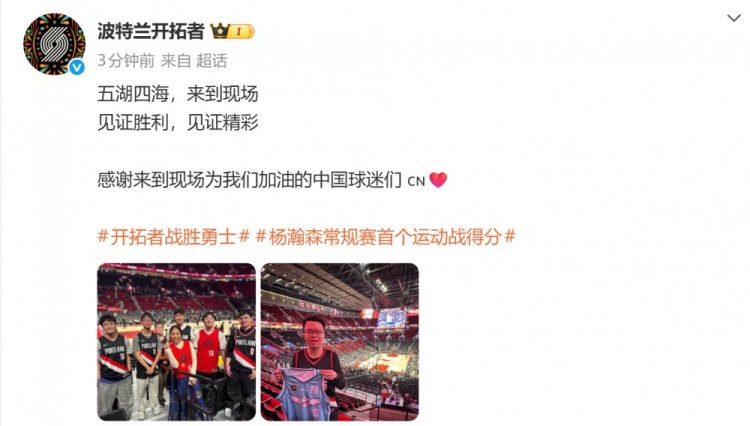 一群中国球迷到现场为杨瀚森加油!开拓者官博表示感谢