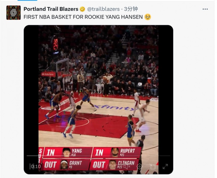2025-10-25 16:35:39NBA生涯首个运动战进球!开拓者官推连发三条杨瀚森动态