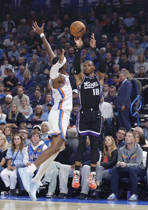 国王首发4号位基根-穆雷缺阵,此役又是威少重返俄城,国王主教练很懂人情世故,威少上首发,摆一大四小阵容:208公分小萨博尼斯+198公分德罗赞+196公分拉文+193公分威少+185公分施罗德。