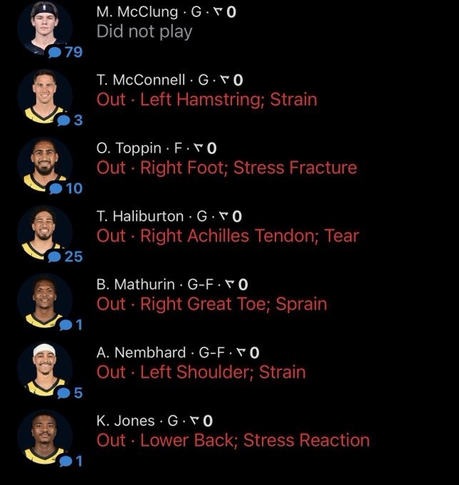 2025-11-02 17:24:21残阵赢球!步行者7名球员缺阵 包括哈利、马瑟林、内少等主力