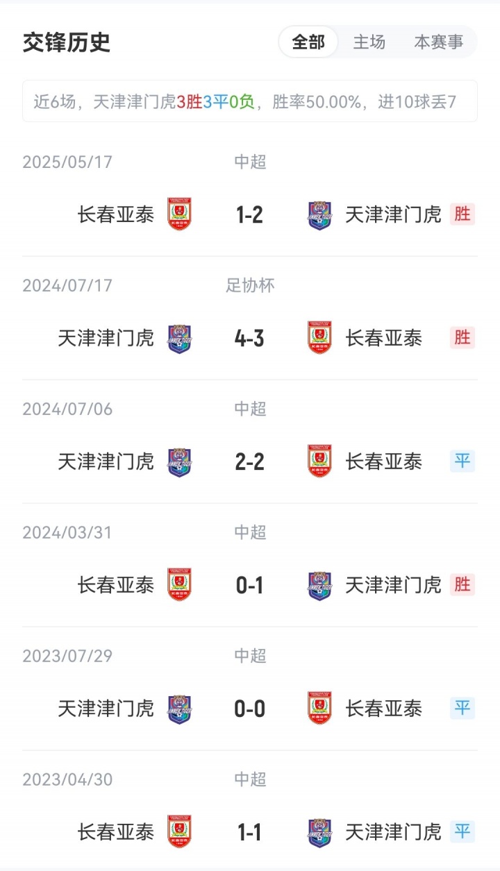 两队在上轮比赛中均输球,在最近6次交手中,津门虎3胜3平保持不败。