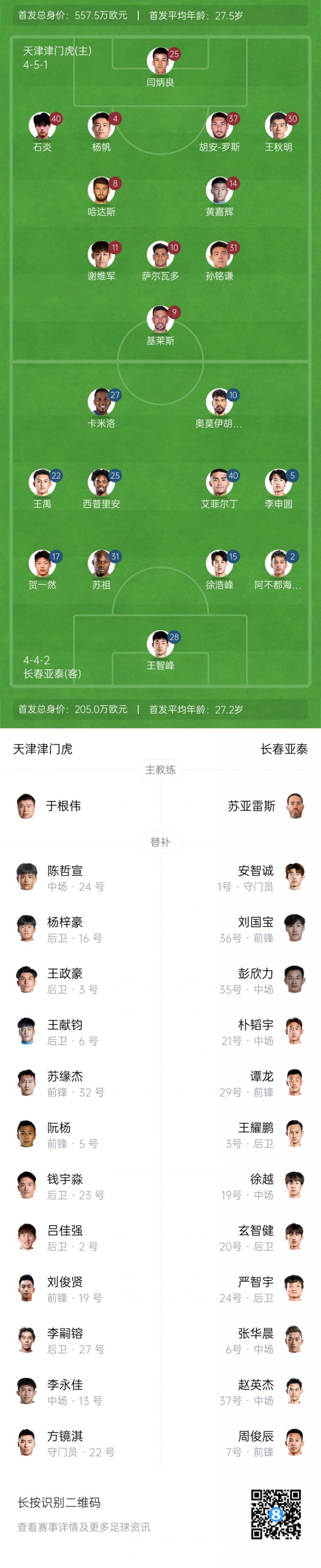 长春亚泰替补:1-安智诚、3-王耀鹏、6-张华晨、7-周俊辰、19-徐越、20-玄智健、21-朴韬宇、24-严智宇、29-谭龙、35-彭欣力、36-刘国宝、37-赵英杰