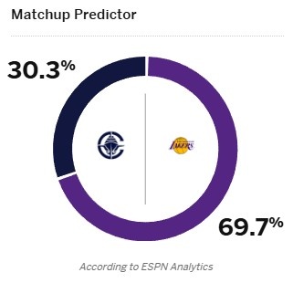 2025-11-25 16:10:38近况迥异!ESPN预测明日洛城德比胜率:快船仅30.3% 湖人69.7%